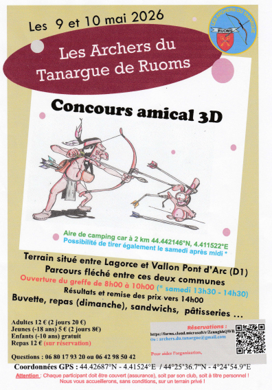 Le 9 et 10 Mai 2026, les Archers du Tanargue à Ruoms organisent leur concours amical 3D.