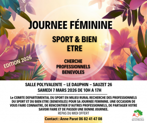 Le CDSMR 07/26 recherche des professionnels bénévoles du sport et bien être pour sa journée féminine du 7 Mars dans le Drôme!! L’occasion de vous faire connaître auprès de nouvelles personnes, de partager votre savoir faire avec d’autres professionnels.